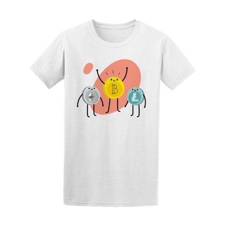 - Model: Teeblox | Idea of Crypto forex. Cartoon bitcoin character. Bitcoin stands with Etherium and Litecoin. Vector illustration.